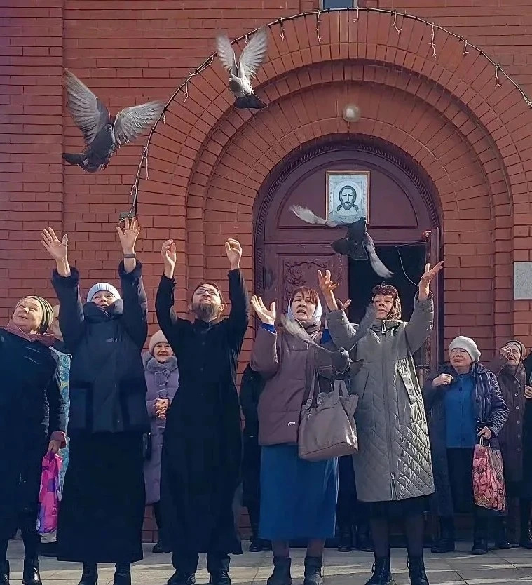 После Литургии, по благословению епископа Нерчинского и Краснокаменского Макария, по древней традиции священнослужитель вместе с прихожанами выпустил в небо голубей со ступеней храма.